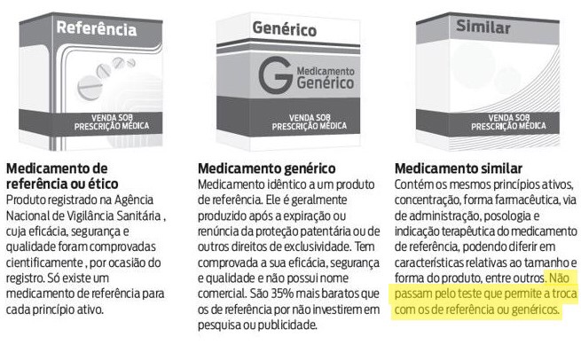 Os medicamentos similares são aqueles que também tem uma “marca”. Podem ter algumas características diferentes. Esses não passam por testes que permite a troca com os de referência ou genéricos.