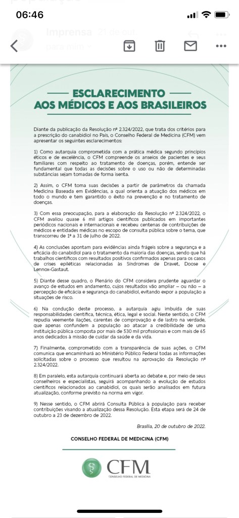 A decisão anterior, que restringia o uso, se apoiou em mais de seis mil artigos científicos, mundialmente reconhecidos. Ainda afirmou que não se conheciam efeitos colaterais, possíveis interações com outras substâncias e o potencial para dependência. Afirmou também não ter encontrado estudos randomizados, duplo-cegos e multicêntricos que comprovem a eficácia do uso de nenhum canabidiol em outras patologias. A Associação Brasileira de Psiquiatria apoiou essa resolução do CFM,afirmando que até o momento não há nenhum estudo de comprovação científica da eficácia e da segurança do emprego de canabidiol em doenças psiquiátricas. Não faz sentido dias depois o CFM iniciar uma consulta à população sobre o uso, decisão que deveria ser baseada nos preceitos elencados pelo próprio conselho anteriormente. É de causar muito estranheza essa mudança tão repentina e em tão pouco tempo.