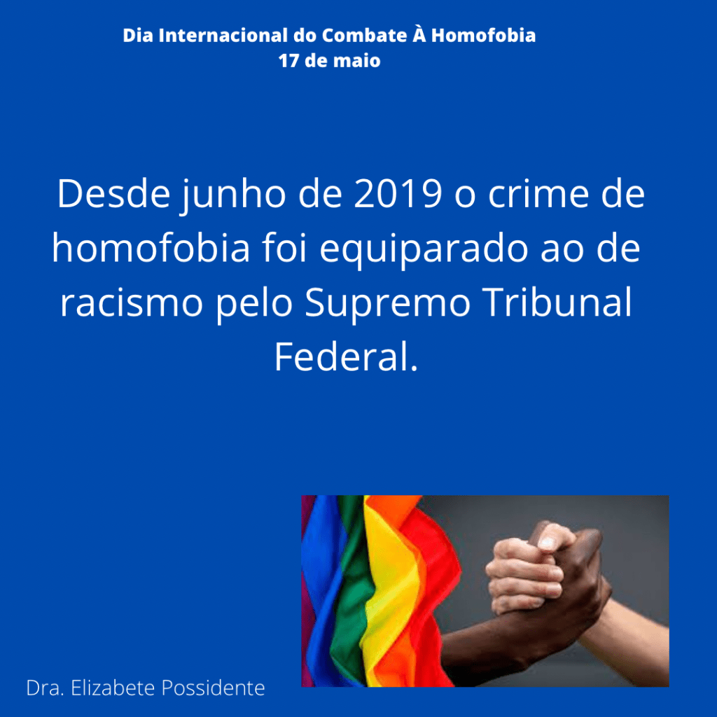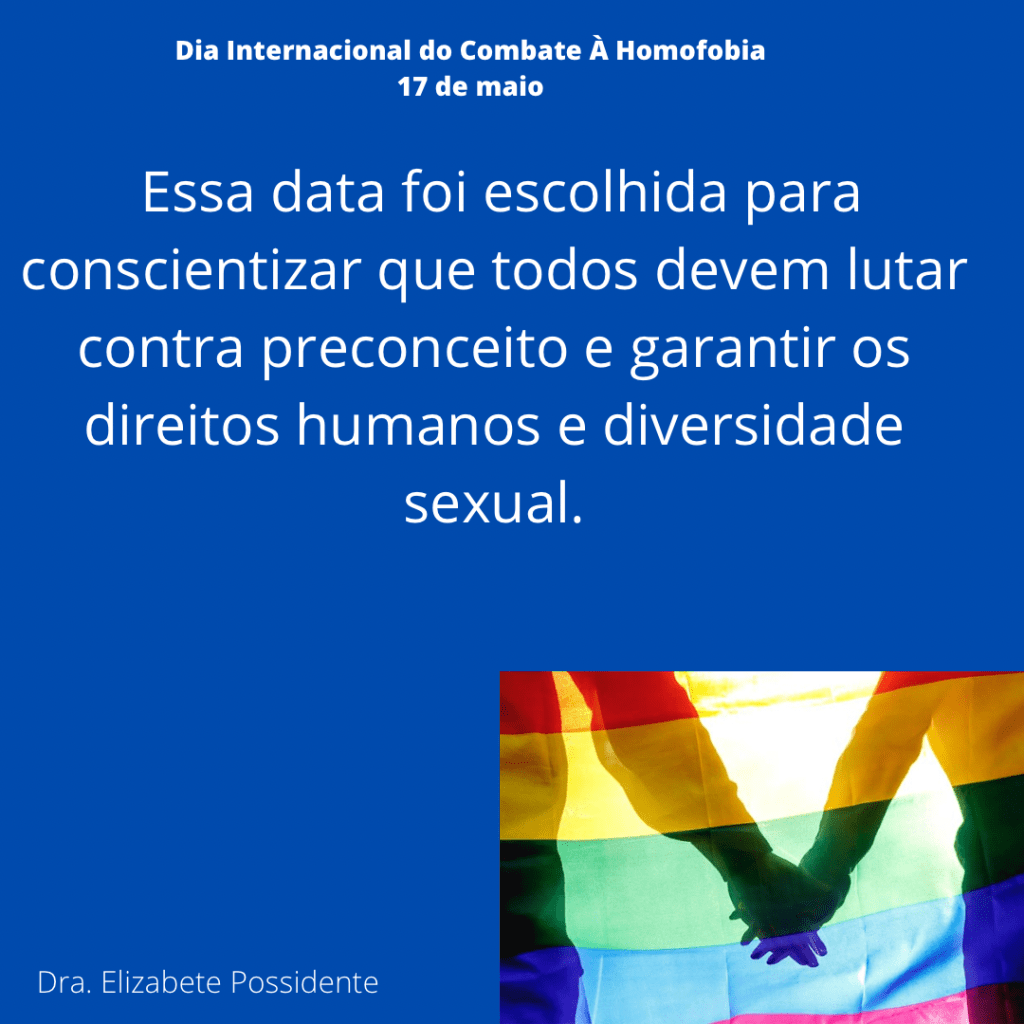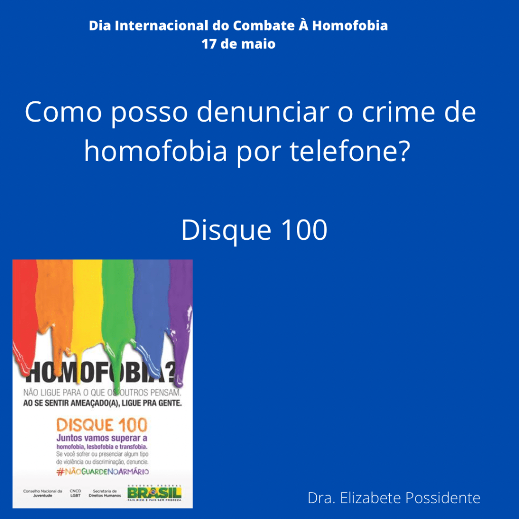 O dia 17 de maio em 1990 foi dado o fim na classificação da homossexualidade como doença pela OMS na Classificação Diagnóstica Internacional de doenças e problemas relacionados á saúde (CID). Desde então, essa data foi escolhida para ser o dia Internacional do Combate á Homofobia. Essa data foi criada para conscientizar que todos devem lutar contra o preconceito e a violência e garantia dos direitos humanos e diversidade de gênero. No Brasil, o Supremo Tribunal Federal (STF) em junho de 2019 decidiu que o crime de homofobia deve ser equiparado ao de racismo. Veja nas gravuras abaixo do meu instagram formas de denunciar pela internet e por telefone esse tipo de crime.