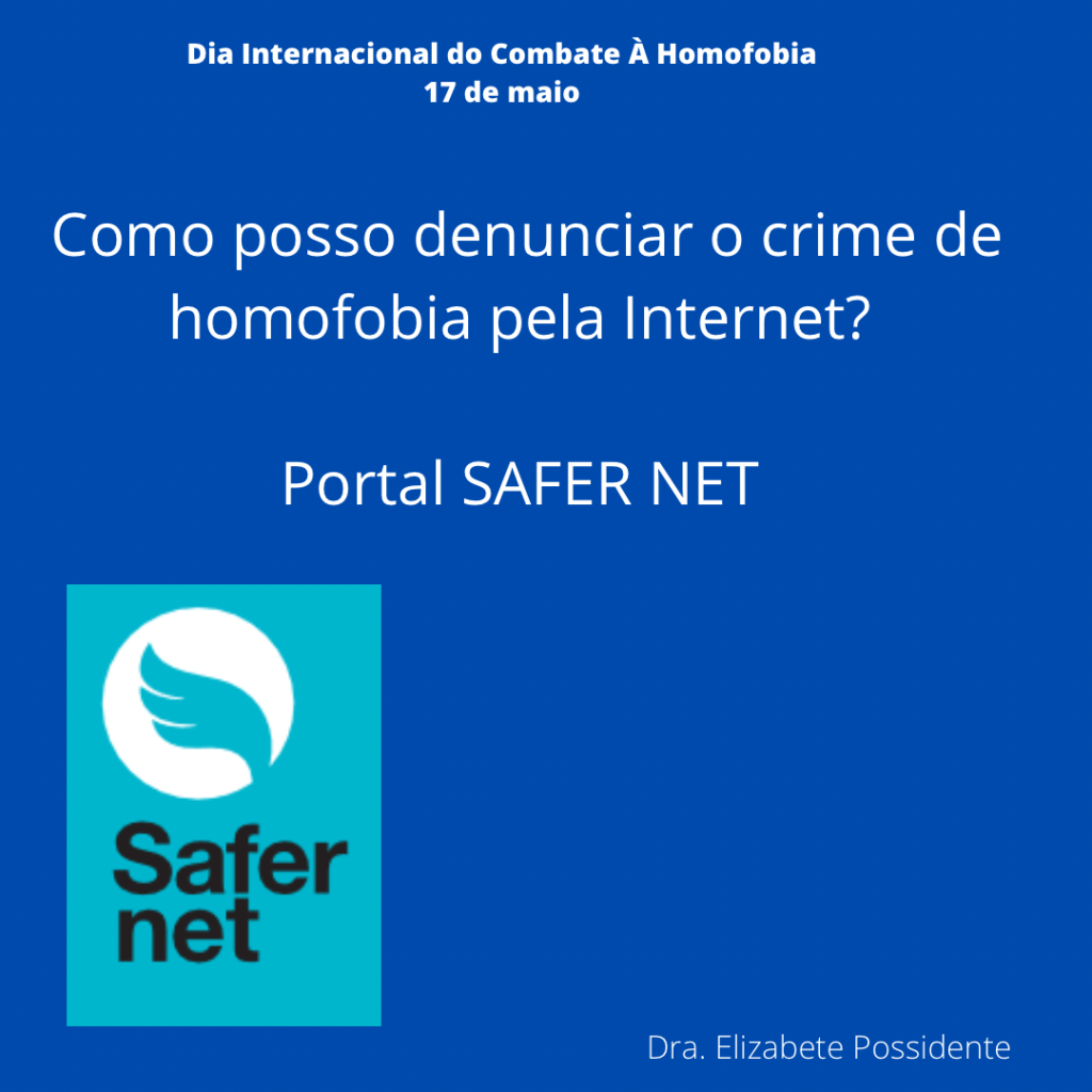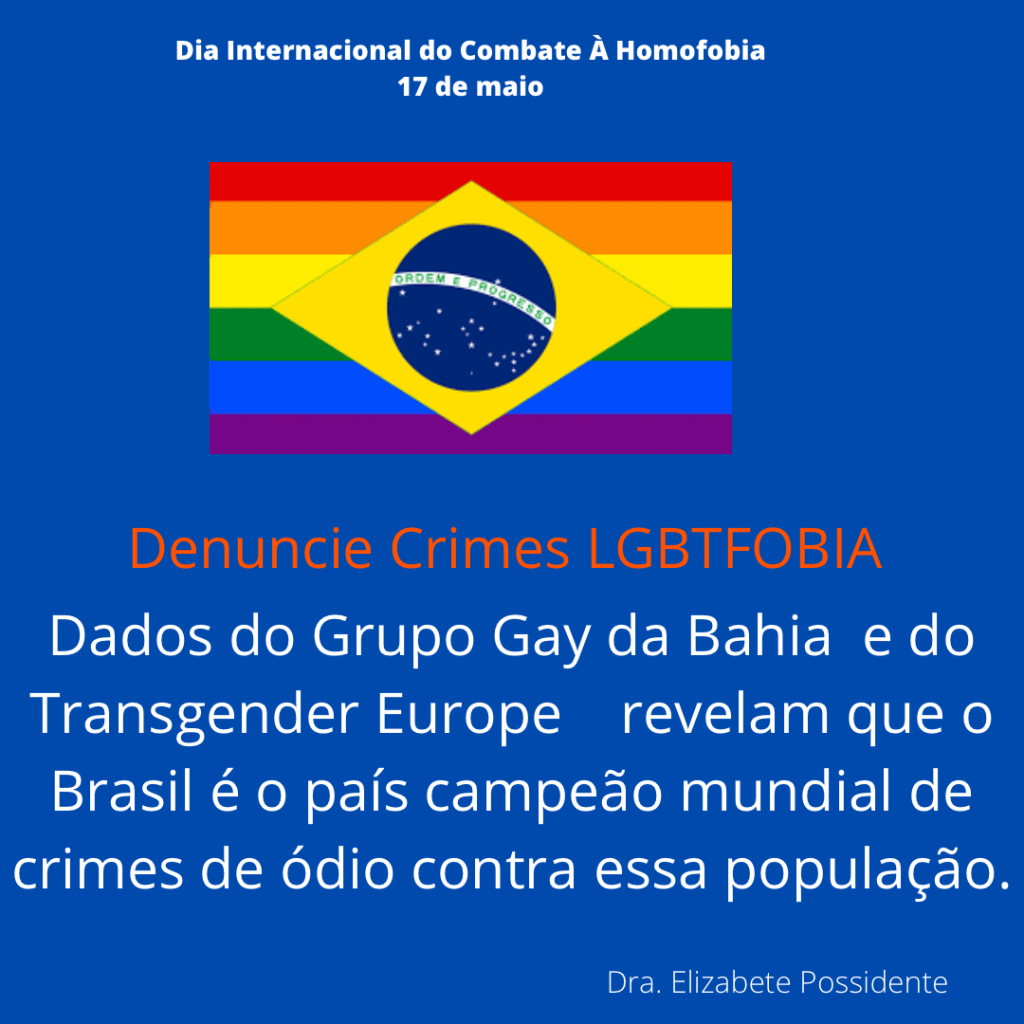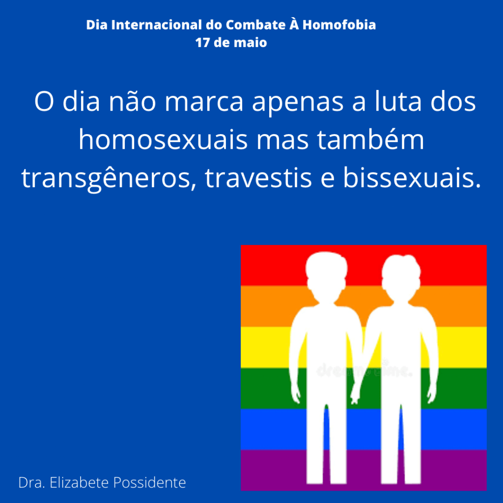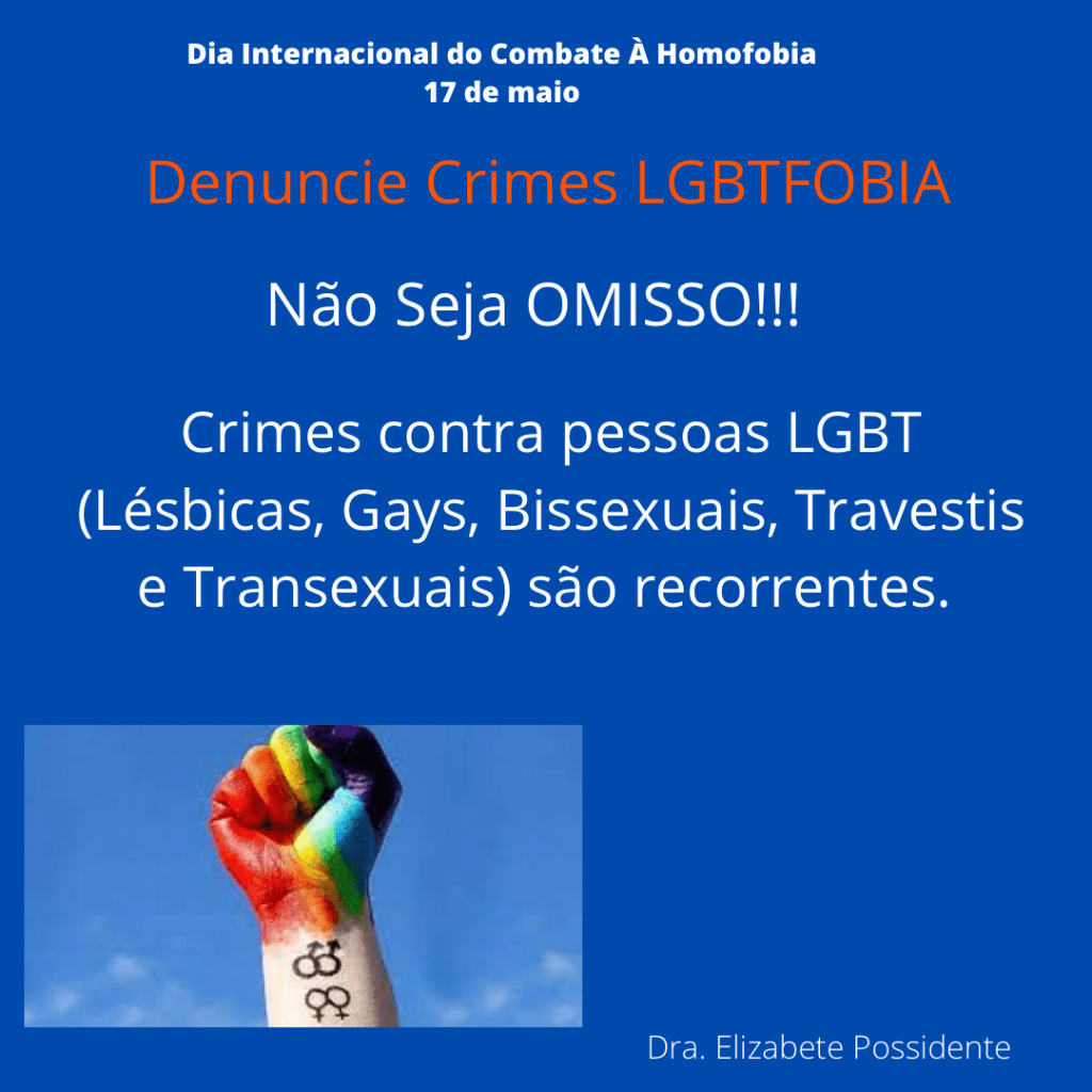 O dia 17 de maio em 1990 foi dado o fim na classificação da homossexualidade como doença pela OMS na Classificação Diagnóstica Internacional de doenças e problemas relacionados á saúde (CID). Desde então, essa data foi escolhida para ser o dia Internacional do Combate á Homofobia. Essa data foi criada para conscientizar que todos devem lutar contra o preconceito e a violência e garantia dos direitos humanos e diversidade de gênero. No Brasil, o Supremo Tribunal Federal (STF) em junho de 2019 decidiu que o crime de homofobia deve ser equiparado ao de racismo. Veja nas gravuras abaixo do meu instagram formas de denunciar pela internet e por telefone esse tipo de crime.